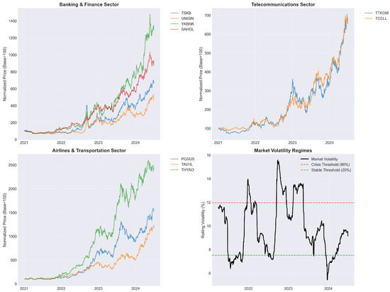 Price evolution by sector and market volatility regimes. The figure displays normalized price series (base = 100) for major BIST sectors during January 2021–June 2024. Banking and finance (top-left) shows extreme heterogeneity and volatility. Telecommunications (top-right) exhibits sustained growth with periodic corrections. Airlines and transportation (bottom-left) demonstrates explosive growth patterns. Market volatility regimes (bottom-right) identify crisis periods (above 80th percentile) and stable periods (below 20th percentile) based on rolling 3-month volatility estimates.