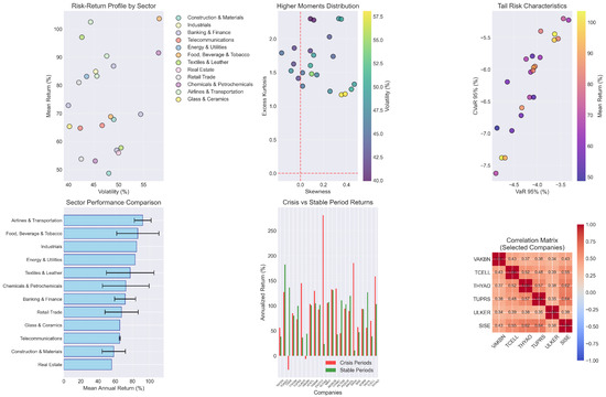 Statistical characteristics supporting DR-MSCO framework requirements. Top row: Risk–return profiles by sector (left), higher moments distribution (center), and tail risk characteristics (right). Bottom row: Sector performance comparison with error bars (left), crisis versus stable period return comparison (center), and correlation matrix for selected representative companies (right). The analysis demonstrates parameter uncertainty, distributional non-normality, multi-dimensional risk structures, and regime-dependent behavior that motivate robust portfolio optimization approaches.
