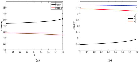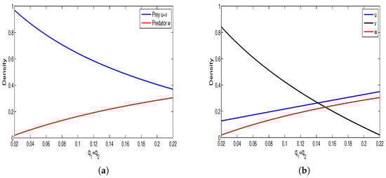We conduct some numerical simulations to investigate the characteristics of the model (4) when some key parameters change. By changing the parameter  while keeping other parameters constant (assuming ), the result is shown in Figure 1. From Figure 1a, it can be observed that an increase in harvest intensity leads to a decrease in total prey density and an increase in predator density. Figure 1b shows that the density of susceptible prey also increases with an increase in harvest intensity. In addition, we also simulated the effect of parameter  (reflecting the negative impact of infected prey on predators) on the model solution (see Figure 2). Figure 2a shows that the total density of prey increases with an increase in , while the density of predators decreases accordingly, and Figure 2b shows that the total density of susceptible prey decreases with an increase in .