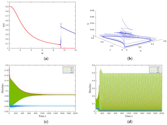 With the help of the drawing tool MATLAB R2021a, we use the continuation method to obtain the maximum and minimum values of the solution curves within a certain range as the bifurcation parameter  or  continuously changes, and obtain the Hopf bifurcation curves. The results are shown in Figure 3 and Figure 4. By changing the value of  (reflecting the infection force), we observe that the coexistence equilibrium  loses its stability and undergoes Hopf bifurcation when , and a stable limit cycle appears when  is greater than the critical value . as shown in Figure 3a. Figure 3b shows the solution trajectory of model (4) starting from  when . Figure 3c and Figure 3d are the time series diagrams of model (4) when  and , respectively. By changing the value of , we observe that the coexistence equilibrium  loses its stability and undergoes Hopf bifurcation when parameter  decreases through , and a stable limit cycle appears when  is lower than  as  decreases, as shown in Figure 4a. Figure 4b shows that a stable limit cycle occurs when . Figure 4c and Figure 4d are the time series diagrams of model (4) when  and , respectively.