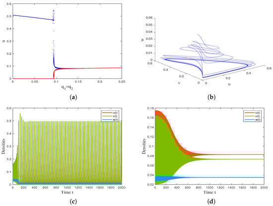 (a) Bifurcation diagram of model (4) with varying infection force . (b) The phase diagram of the model (4) when . (c) Time series diagram of model (4) when . (d) Time series diagram of model (4) when . Other parameter values are β = 0.17, c = 0.004, γ = 10, d1 = 0.25, d2 = 0.2, d3 = 0.7, m = 0.6, n = 0.3, q1 = 0.1, q2 = 0.1, l = 0.5.
