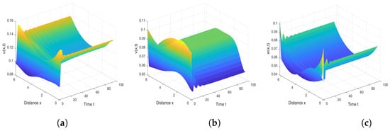 We next perform numerical simulations to demonstrate the existence of non-constant positive steady states for model (13). Using the fixed parameter set () with diffusion coefficients  in the one-dimensional domain , we obtain the solution surfaces for all three species, as shown in Figure 5. The simulation results clearly reveal two key findings: First, system (13) admits spatially heterogeneous positive solutions under these parameter conditions, thereby confirming the existence of non-constant positive steady states for model (3). Second, we observe a distinct spatial segregation pattern where susceptible prey and predator populations predominantly concentrate near habitat boundaries, while infected prey aggregate in interior regions.