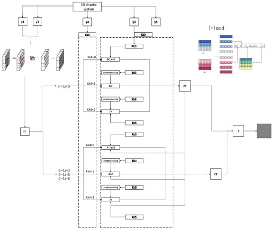 Currently, chaotic systems are mainly applied in chaotic image encryption. Among them, five-dimensional chaotic systems can be more effectively integrated with image encryption algorithms. In Figure 1, we illustrate a general approach for fusing a five-dimensional system with an encryption algorithm for reference.