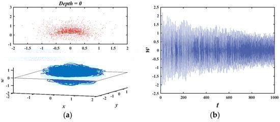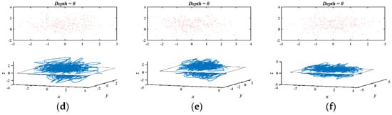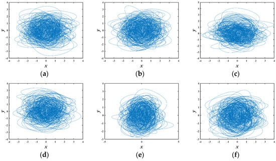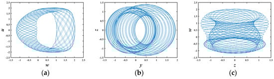The corresponding phase diagrams (x–w plane, x–u plane, and y–w plane) for these two initial conditions are shown in Figure 4. It is evident that the surfaces in Figure 4a–c are smooth, indicating quasi-periodic motion. In contrast, Figure 4d–f shows irregular patterns, representing chaotic motion.