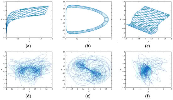 Phase diagram. (a–c) Quasi-periodic motions in x–w, x–u, and y–w planes. (d–f) Corresponding chaotic attractors in the same projection planes.