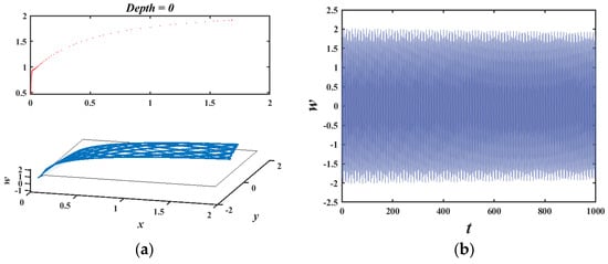 Meanwhile, to further substantiate the chaotic dynamics examined in Section 3.1 and Section 3.2, we randomly selected some parameters within the chaotic interval and plotted their phase diagrams shown in Figure 19, as well as the Poincaré cross sections and time series diagrams shown in Figure 20 and Figure 21.
