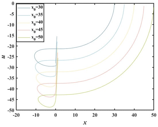 In this subsection, the offset boost behavior in the system will be explained using phase diagrams. When the initial value x0 is the variable and the parameter configuration is selected as a = 20, b = 1, c = 1, d = 1, e = 1, q = 0.98, y0 = 1; z0 = 1; w0 = 1; u0 = 1, the x–u phase trajectory diagrams for x0 = 30, 35, 40, 45, 50 are shown in Figure 7. Examining these figures, numerical simulations show that the system’s phase space trajectories display displacement behavior in both the x and u directions. As x0 increases, the phase trajectories in Figure 7 show varying degrees of offset in both the x and u directions, overall appearing to shift along the u–axis.