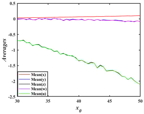 The offset boosting phenomenon can be effectively characterized by examining the mean values of system variables. Figure 8 demonstrates the x0-dependence of mean values for all state variables. It can be observed that the mean values of x and u show systematic variation with increasing x0, confirming attractor displacement along these axes. In fact, the phase trajectories of system (3) also show a significant shift along the z–axis.
