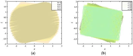 The motion state of a chaotic system depends directly on its parameters, and selecting appropriate parameters can lead to diverse dynamic behaviors. When examining the role of parameter b in system (3), with a = 20, c = 1, d = 1, e = 1, q = 0.98, and all other initial values set to 1, the experimental results show that as b increases, the system’s phase trajectories rotate around fixed points in the phase space, as shown in the x–z phase diagrams in Figure 9a. For four values of b (−2, 0, 2, 4), the trajectories display increasing rotation with increasing b. Similarly, Figure 9b illustrates the x–z phase diagrams for varying c, with a = 20, b = 1, d = 1, e = 1, q = 0.98, and other initial values fixed at 1. For c values of (21, 22, 23, 24), the phase trajectories also show rotational behavior as c increases.