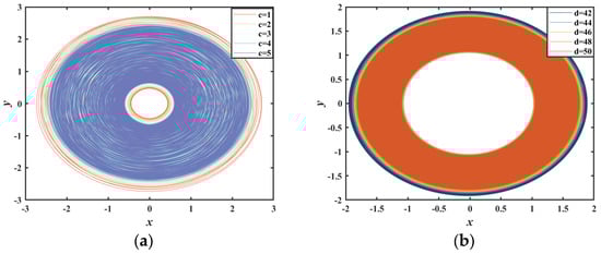 The contraction behavior of the phase trajectory: (a) c = 1, 2, 3, 4, 5; (b) d = 42, 44, 46, 48, 50.