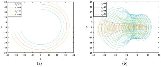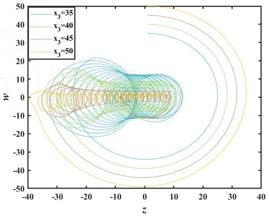 System (3) displays additional intriguing dynamical phenomena under the parameters set to (a, b, c, d, e, q) = (20, 1, 1, 1, 1, 0.98), starting from initial conditions uniformly set to 1. When x3 is selected as the control variable, the z–w phase trajectories for x3 = {35, 40, 45, 50} are plotted in Figure 11. Observations reveal a phase trajectory reversal mechanism: contraction dynamics, where trajectories initialized with larger x3 values progressively contract into smaller phase-space regions over time, and expansion dynamics, where trajectories starting from smaller x3 values expand into broader domains during evolution. To clarify this counterintuitive behavior, Figure 12 compares instantaneous phase trajectories at different times: the initial phase (Figure 12a), where phase trajectories are expansive for large x3 and compact for small x3, and the late phase (Figure 12b), where an inverted amplitude distribution emerges, with contracted trajectories for initially large and expanded trajectories for initially small.