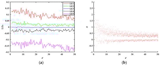 Dynamical behavior analysis. (a) LE1-LE5 versus parameter e. (b) Bifurcation diagram versus parameter e.