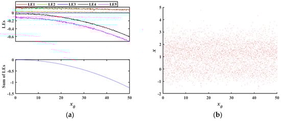 Dynamic behavior analysis through Lyapunov exponent sum of LEs and bifurcation diagram. (a) (Top) Lyapunov exponent spectrum (LE1–LE5) versus initial condition x0. (Bottom) Corresponding Lyapunov exponent sum (ΣLEs). (b) Bifurcation diagram versus initial condition x0.