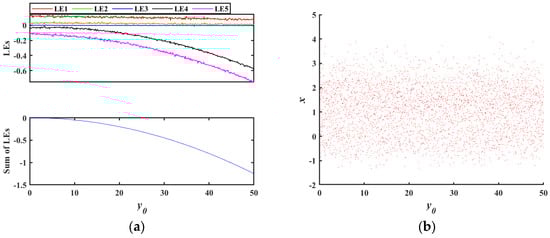 Dynamic behavior analysis through Lyapunov exponent sum of LEs and bifurcation diagram. (a) (Top) Lyapunov exponent spectrum (LE1-LE5) versus initial condition y0. (Bottom) Corresponding Lyapunov exponent sum (ΣLEs). (b) Bifurcation diagram versus initial condition y0.