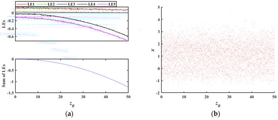 Dynamic behavior analysis through Lyapunov exponent sum of LEs and bifurcation diagram. (a) (Top) Lyapunov exponent spectrum (LE1-LE5) versus initial condition z0. (Bottom) Corresponding Lyapunov exponent sum (ΣLEs). (b) Bifurcation diagram versus initial condition z0.