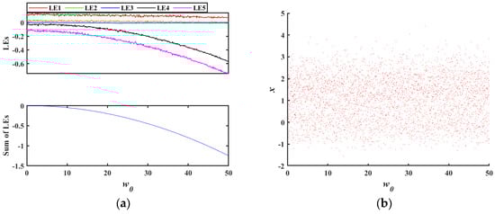 Dynamic behavior analysis through Lyapunov exponent sum of LEs and bifurcation diagram. (a) (Top) Lyapunov exponent spectrum (LE1-LE5) versus initial condition w0. (Bottom) Corresponding Lyapunov exponent sum (ΣLEs). (b) Bifurcation diagram versus initial condition w0.
