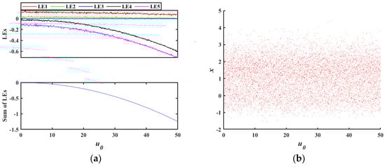Dynamic behavior analysis through Lyapunov exponent sum of LEs and bifurcation diagram. (a) (Top) Lyapunov exponent spectrum (LE1-LE5) versus initial condition u0. (Bottom) Corresponding Lyapunov exponent sum (ΣLEs). (b) Bifurcation diagram versus initial condition u0.