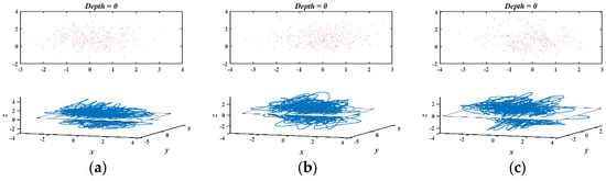 In addition, according to Reference [], our further research reveals that the system exhibits a unique transient transition behavior related to the order q. When q = 0.7, the system exhibits a clear transition from chaos to quasi-periodicity, as shown in Figure 24a. As q increases to 0.85, this transition weakens and the orbit instead converges to a metastable state that lies between chaos and quasi-periodicity; Figure 24b explicitly illustrates this phenomenon. For q = 0.98, the transitional behavior disappears completely, showing only chaos-to-chaos dynamics, as shown in Figure 24c.