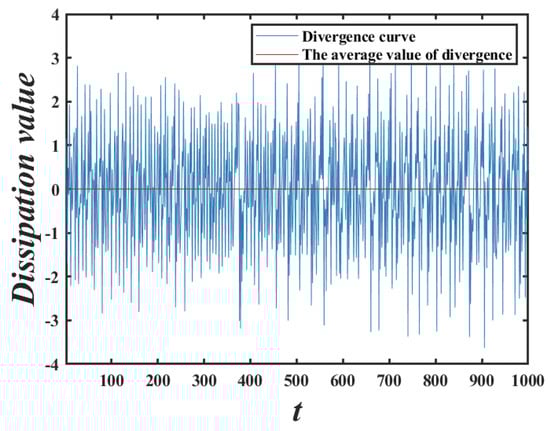 Furthermore, based on the dissipation formula (2), we plotted the dissipation curve and the average value of divergence over a period of time for the system under conservative parameters (a, b, c, d, e, q) = (1, 1, 1, 1, 1, 0.98) with initial values (1, 1, 1, 1, 1), as shown in Figure 22. It can be seen that the divergence curve oscillates around the zero axis while the average value of divergence is 0 indicates that the system is conservative under these conditions.