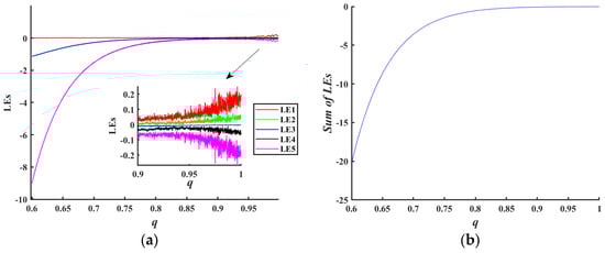 Dynamical behavior analysis through Lyapunov exponent sum of LEs and bifurcation diagram. (a) Lyapunov exponent spectrum (LE1-LE5) versus parameter q. (b) Corresponding Lyapunov exponent sum (ΣLEs).