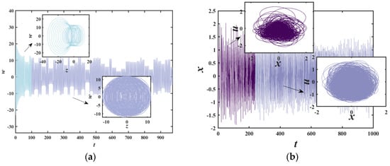 Meanwhile, we further explored whether the integer-order of the system has such a dynamic behavior of transition from a chaotic to a quasi-periodic state under different parameters: under the parameter configuration (a, b, c, d, e, q) = (20, 1, 1, 1, 1, 1) and with initial conditions (35, 1, 1, 1, 1), the system demonstrates chaos-to-chaos transitions, as illustrated in Figure 25a; under the parameter configuration (a, b, c, d, e, q) = (7, 7, 7, 7, 7, 1) with x0 = 1.2; y0 = 1.2; z0 = 1.2; w0 = 1.2; u0 = 1.2, the system demonstrates chaos-to-chaos transitions, as illustrated in Figure 25b.