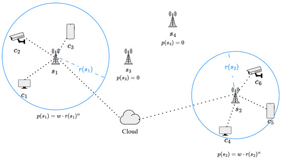 In a typical WSN, the coverage area of the sensor is a disk centered around the sensor, where the radius of the disk is determined by the power of the sensor. The relationship between the power of a sensor node s and its radius of coverage area is , where and are constants. We usually refer to as the attenuation coefficient. The schematic diagram of the power cover problem in WSNs, as shown in Figure 1, illustrates how sensors (e.g., ) serve clients () within their coverage areas, indicated by radii (e.g., , ) shown in blue. The diagram also depicts communication links between sensors and other network components, such as the cloud.