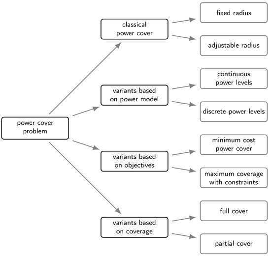 In the field of combinatorial optimization, many classical problems have been extensively studied due to their wide applicability, including the vertex cover problem [1], the facility location problem [2], the machine scheduling problem [3], the cloud–edge collaborative computation offloading problem [4], and so on. These problems often serve as foundational models for more complex and application-driven variants. The power cover problem arises as such a variant, motivated by practical needs in wireless sensor networks (WSNs), where the coverage area of each sensor depends on its transmission power.