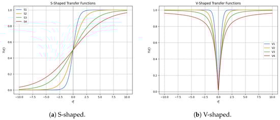 In the literature [], a variety of transfer functions are proposed for this purpose. They are generally categorized into two main families based on their shape and behavior: S-shaped and V-shaped functions. These two families represent the most common and well-established approaches for mapping continuous search spaces to binary ones.