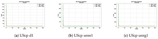 where and represent the average value delivered by algorithms A and B. We consider that if the p-value is less than 0.05, the hypothesis will be rejected, with hypothesis being accepted and these cases are highlighted in bold and underlined in the tables.