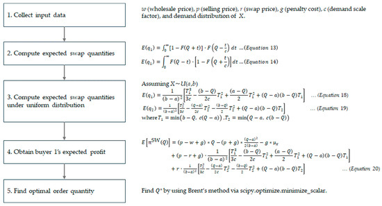 When making procurement decisions, Buyer 1 determines the optimal order quantity, Q*, that maximizes in expression (20). However, the complexity of the expected profit function makes it too challenging to derive the optimal order quantity in a closed form. This study adopts a numerical method, determining the optimal order quantity using the minimize_scalar function from Python’s scipy.optimize package (Python version 3.10.0). This function is based on Brent’s method, which combines bisection, linear interpolation, and quadratic interpolation. Brent’s method is particularly well-suited for this type of problem, as it efficiently locates the extremum of a continuous, nonlinear function of a single variable without requiring derivative information [22]. Moreover, it provides high numerical precision with no fixed time complexity, making it a robust and practical choice for solving the optimal ordering problem in this study.
