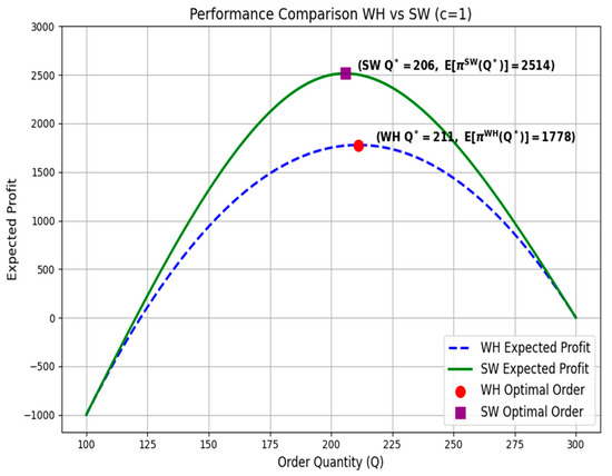 Specifically, in the WH strategy, the optimal order quantity is 211 units, with an expected profit of 1,778. In contrast, under the SW strategy, the order quantity is slightly decreased to 206 units (−2.4%), while the expected profit is significantly increased to 2514 (+41.4%). The relatively lower optimal order quantity under the SW strategy is primarily attributed to the flexibility provided by the swap mechanism, which enables effective responses to both excess inventory and shortages. The SW strategy allows a buyer to procure surplus inventory from another buyer when demand exceeds expectations, and conversely, to transfer surplus inventory to another buyer and earn additional revenue when demand falls short of expectations. This structure enables stable fulfillment of demand without excessive pre-ordering, thereby allowing for efficient operations even with a lower order quantity. However, it should be noted that a lower order quantity in the SW strategy should not be generalized, as it may vary depending on the demand structure, inter-buyer relationships, and the terms of the swap contract. Changes in the optimal order quantity may vary depending on factors such as demand structure, relationships between buyers, and swap conditions; these aspects are discussed in greater detail in the sensitivity analysis in Section 4.2 and Section 4.3.