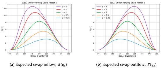An interesting observation is that the order quantity, Q, that maximizes and varies with the value of c. Specifically, as c increases, the value of Q that maximizes decreases, while the value that maximizes increases. This outcome can be explained as follows: The expected swap inflow, , represents the amount of shortage that the focal buyer can replenish from the collaborating buyer’s surplus inventory. The swap inflow is determined by the minimum of the focal buyer’s shortage and the collaborating buyer’s surplus. The peak of the curve occurs when these two quantities are equal. As c increases, the collaborating buyer’s demand becomes relatively larger, leading to more surplus inventory at a given order quantity. Consequently, the limiting factor for gradually shifts from the collaborating buyer’s surplus to the focal buyer’s own shortage. As a result, the point of equality between shortage and surplus occurs at a smaller Q, causing the peak of to shift leftward as c increases. Similarly, the peak of shifts rightward as c increases, since higher demand from the collaborating buyer leads to greater shortages on their side. To support more swap outflows, the focal buyer must order more to generate sufficient surplus. These opposing shifts intuitively illustrate how ordering decisions are structurally adjusted under the swap-integrated procurement strategy.