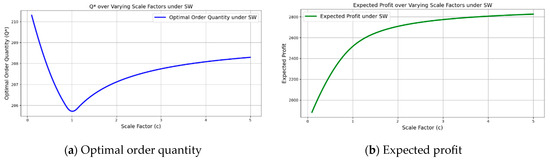 Optimal order quantity and expected profit under the SW strategy across varying scale factors. (a) A pattern in which the optimal order quantity reaches its minimum around c = 1 and increases as c becomes either smaller or larger. (b) A gradual increase in expected profit with increasing values of c.