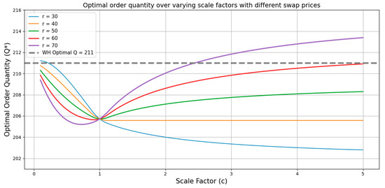 Optimal order quantity across varying scale factors under different swap prices. The solid lines illustrate how optimal order decisions adjust in response to changes in demand asymmetry and swap pricing. Notably, the order quantity remains unchanged when c = 1 and shows opposing trends depending on whether swap price, r, is high or low. The dashed line represents the optimal order quantity under the WH strategy and is provided for comparison.