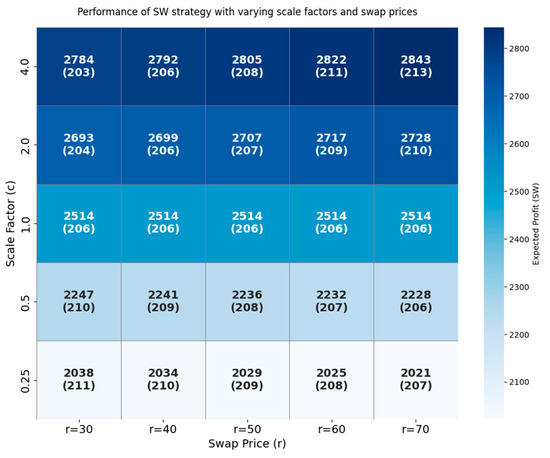 The subsequent analysis examines how variations in the swap price, r, and the demand scaling factor, c, affect the expected profit under the SW strategy. Figure 7 presents a heatmap that visualizes the expected profit across different combinations of r and c, thereby illustrating how the profitability of the SW strategy varies depending on the procurement environment. The results reveal that the expected profit under the SW strategy generally increases with the demand scaling factor, c. A higher value of c implies greater demand from the collaborating buyer, which in turn increases the likelihood of successful swap transactions and enhances the opportunity to offload excess inventory under favorable conditions.
