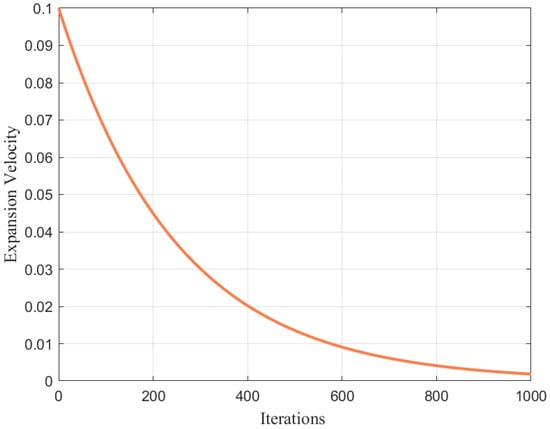 where t is the iteration step, T is the maximum number of iterations, and is the expansion decay factor, which controls the precision of the exploration phase. Through experiments, its value is fixed at 0.1. The trend of Equation (3) is shown in Figure 2.