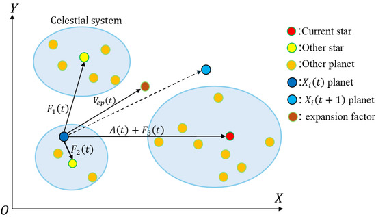 where represents the mass of the current celestial body, denotes the mass of the c-th star, and represents the mass of the largest star (also the fitness of the current optimal solution). A very small positive number is introduced to avoid the case where the divisor tends to infinity when = 0.
