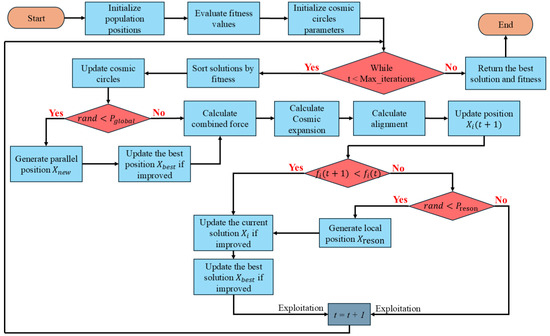 The workflow of the CEO algorithm is illustrated in Figure 6, and its pseudo-code is presented as Algorithm 1. During the initialization process, all initial candidate solutions are sorted according to fitness in sequence to generate three stellar celestial bodies. The stellar celestial bodies attract surrounding planetary celestial bodies to form a stellar celestial body system, which enters the early iteration stage.