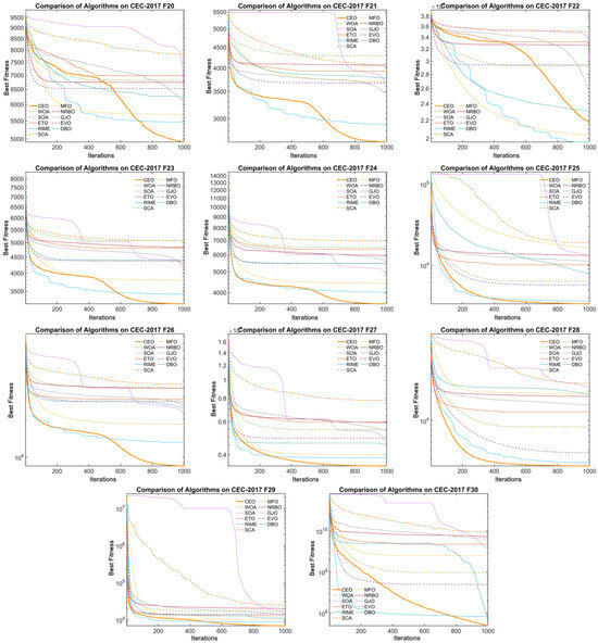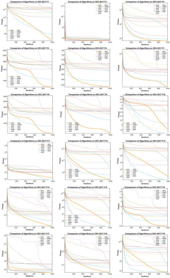 - The capabilities of the CEO algorithm were tested on 29 CEC2017 benchmark functions with 30-dimensional, 50-dimensional, and 100-dimensional spaces and compared with ten other advanced metaheuristic algorithms. CEO demonstrated superior performance in benchmark function tests.