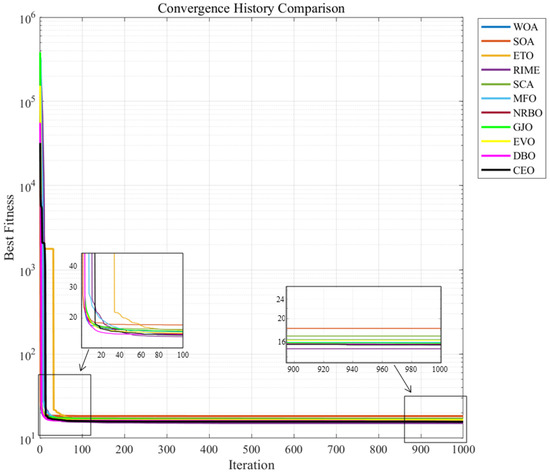 The computational complexity of the CEO algorithm primarily depends on four factors: population initialization, fitness function evaluations and sorting, solution updates, and cosmic circle updates. Assuming N is the number of solutions, dim is the dimension of the solution space, and T is the maximum number of iterations, the computational complexity of initializing the population is , where represents the initial fitness evaluation. During the iteration process, the complexity of evaluating and sorting the fitness functions is , the complexity of updating the solutions is , and the complexity of updating the cosmic circles is . Therefore, the total computational complexity of CEO is , which simplifies to .