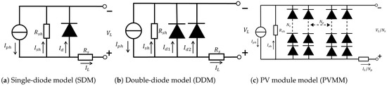 The PVMM is composed of multiple identical photovoltaic cells connected in parallel or series, and its specific circuit model is shown in Figure 14c. The calculation formula for in the PVMM is as follows: