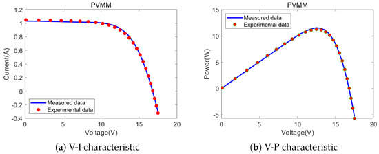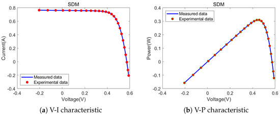 Furthermore, Figure 15, Figure 16 and Figure 17, respectively, show the comparisons between the CEO test results on the SDM, DDM, and PVMM and the actual measured values. As shown in Figure 15, Figure 16 and Figure 17, it can be seen that the experimental data obtained by the CEO algorithm can perfectly fit the measured data.