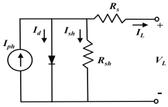 The Single-Diode Model (SDM) describes the current-voltage (I-V) characteristics of a PV cell by modeling it as a diode. In SDM, the total current generated by the PV cell consists of three components, namely, the diode current (), the photogenerated current (), and the current on the shunt resistor (). The diagram of the SDM is illustrated in Figure 1, where , , , and represent the reverse saturation current of the diode, the output voltage, and the series and shunt resistances, respectively. By adjusting these model parameters, it is possible to fit the data of a real PV cell. The output current can then be formulated as follows.