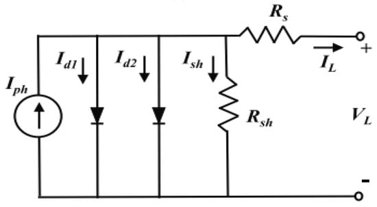 The Double-Diode Model (DDM) accounts for the effects of both series and parallel resistances within a PV cell and describes its I-V characteristics more accurately than SDM. In DDM, the PV cell consists of an ideal diode and a non-ideal diode in series. The corresponding mathematical formula and structural diagram are shown in Equation (2) and Figure 2, respectively. By adjusting the model parameters, the data from an actual PV cell can be more accurately fitted.