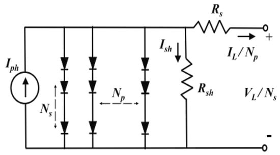in which the number of solar cells connected in parallel and series are represented by and , respectively. As shown in Equation (4), MM similarly to SDM involves five unknown parameters.