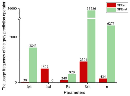 The existing adaptive techniques in DE and PSO usually focus on dynamically adjusting control parameters or weights according to the search performance of algorithms, such as JADE [], SaDE [] and APSO []. In contrast, the ATS in GPEat is specifically designed for the threshold parameters used in the reproduction operator, which is crucial for selecting appropriate mutation strategies for different dimensions of the solution space. This targeted adjustment enables GPEat to better handle the significant differences in the feasible regions of decision variables inherent in the problem of parameter estimation for photovoltaic models. In the GPEat algorithm, ATS is designed to use the threshold proportional to the range of each dimension variable of a individual vector to select an appropriate replication operator to generate the next generation of the individual. In order to verify the effectiveness of ATS in GPEat, an ablation experiment concerning ATS with and without ATS within the same algorithmic framework of GPEat is performed. The algorithm without ATS under the same algorithmic framework of GPEat is denoted as GPEnat. GPEat and GPEnat are tested on the STM640/36 model to evaluate the impact of ATS on the performance of the algorithm for the PV problem. The maximum number of function evaluations (FEs) is set to 5000. The convergence curve of one random run is shown in Figure 5, while the usage of the gray prediction operator is shown in Figure 6.