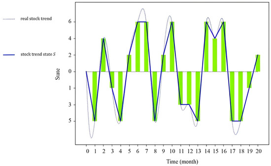 - In order to better discretize continuous data, the traditional discretization method in Table 2 is presented, and then the experimental method in Table 3 is improved to reduce external interference. Table 2 demonstrates that the data underwent straightforward processing and were subsequently input into the HQMM model. While the prediction results were generated, they were significantly influenced by external factors, leading to a lack of robustness and vulnerability to artificial interference. To enable a fair comparison with our improved method, the same approach was employed, whereby the obtained data were categorized into three intervals based on stock price fluctuations. These intervals were represented by the integer values 1, 3, 5, 2, 4, and 6, respectively (Table 3). The value of L is mentioned in formula 8 (through the calculation of GMM mean and variance and MVTF below), and L is converted into the value of S(Observation status in Table 3) and then transformed into a bar graph in Figure 2. The ordinate of the green bar chart is the value of separate S, the dotted line represents the real stock trend value, and the solid line is the line of the midpoint of the bar chart, indicating that the stock trend obtained through the division of S is more realistic.