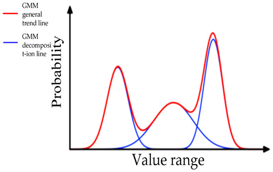 - In an experimental model, the collected data is accurately quantified and decomposed into k models based on the Gaussian probability density function, as shown in Figure 3. (Schematic diagram illustrates GMM, so no scale is required. The red line is the overall trend, which then breaks down into the blue line). Here, a one-dimensional GMM is utilized, the 30-day data is considered and input into a Gaussian mixture model for training, and n is set to 5, where n represents the number of Gaussian mixture components. In order to ensure consistent generalization across all data samples and to avoid the imbalance phenomenon where some data perform exceptionally well while other data significantly deteriorate due to parameter deviations, the above parameters were selected. This means that the GMM model learns five Gaussian distributions and obtains variances () and means () of these Gaussian distributions.