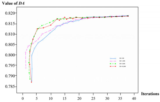 If DA = 1, the model perfectly predicts the stochastic sequence, while 1 > DA 0 means that the model predicts the sequence better than random [22]. If DA < 0, the results indicate that the model performs poorly and is inferior to a random baseline. The more DA converges to 1, the better the model functions. It describes the DA as the loss function used to evaluate the quality of the model training. In repeated experiments, DA demonstrates noise resistance in measurement, with its values eventually converging to a stable state [16]. Subsequently, through the model, the influence of different initialization positions of Kraus (equivalent to data noise) on the training results of the model is calculated, as shown in Figure 5 [16]. The RS represents the random number seed.
