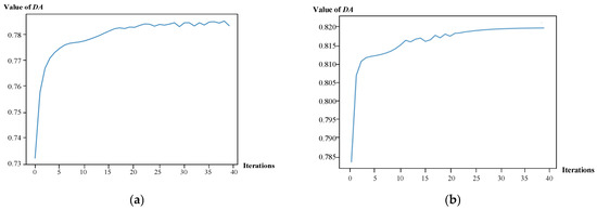 Since different stocks and lengths of prediction time would lead to different prediction performances for both HQMM and HMM, 15 distinct stocks were selected for analysis, and the average performance was calculated to evaluate the models’ performance. During the experiment, for the HQMM model constructed in this paper, the number of hidden states was 6, which was derived through global optimization, while the settings for the Kraus operators and density matrices were retained from prior configurations. This methodology ensures robustness and stability across the full dataset, thereby eliminating performance fluctuations induced by data distribution discrepancies. Additionally, the matrix Z with a dimension of is obtained from the training process. The calculated results of DA for the evenly-discretized continuous data and that processed with MVTF are shown in Figure 6a,b, respectively. It can be found that when the number of iterations is less than 5, the value of DA increases rapidly, while once the number of iterations exceeds 40, the value of DA tends to converge. At this time, the mode training is completed.